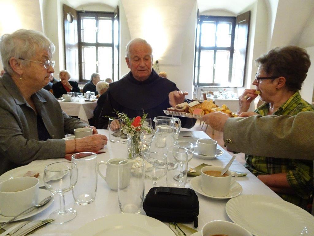 Die launige Begrüßung nahm um 14.30 Uhr Hausherr Pater Simon vor. Anschließend kredenzten die Mitglieder der Katholischen Frauenbewegung köstliche Mehlspeisen und Kaffee auf. Später servierten sie leckere Brötchen, Wein und Wasser. Zwischendurch sorgte das Geschwister-Trio Zöhrer mit ihrer schönen Musik für eine tolle Stimmung. Die Anwesenden unterhielten sich bis zum frühen Abend glänzend. Die älteste Jubilarin war mit 93 Jahren Maria Trieb aus Rothleiten, ältester Gast bei den Männern war Rupert Windisch aus Gams mit 97 Jahren.