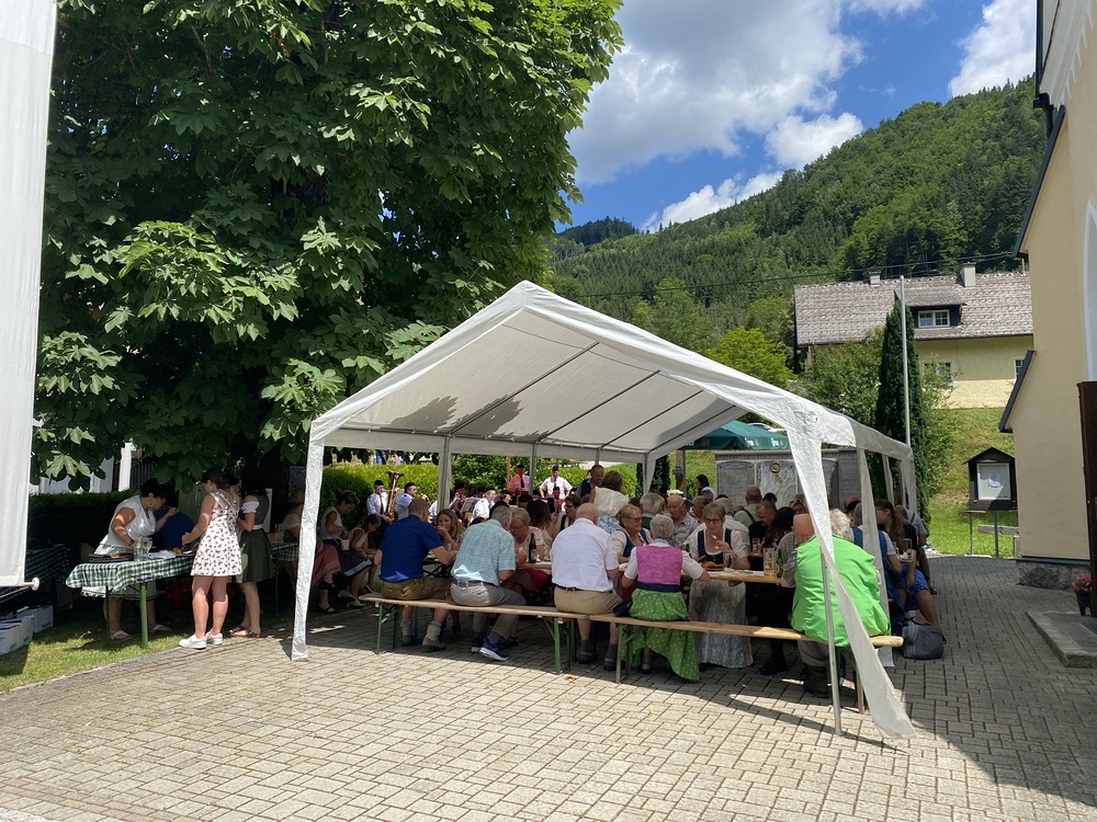 Pater Thomas feierte mit uns das Hochamt um 10:30 Uhr. Geige, Orgel und Trompeten brachten uns in feierliche Stimmung. Nach dem Gottesdienst spielte die Bergknappenkapelle Unterlaussa. Es gab alles von Schnitzel bis Schilcher Charmant.